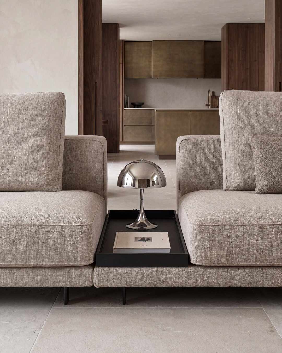 Catena’s additional tray or cushion options allow you to get creative and customise your sofa. The wooden tray allows you seamlessly integrate everyday living into your sofa, offering a refined space for your favourite book, a warm cup of coffee, or a table lamp, right at the heart of your home.