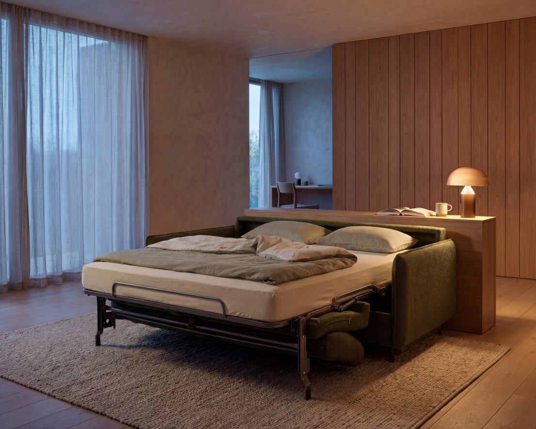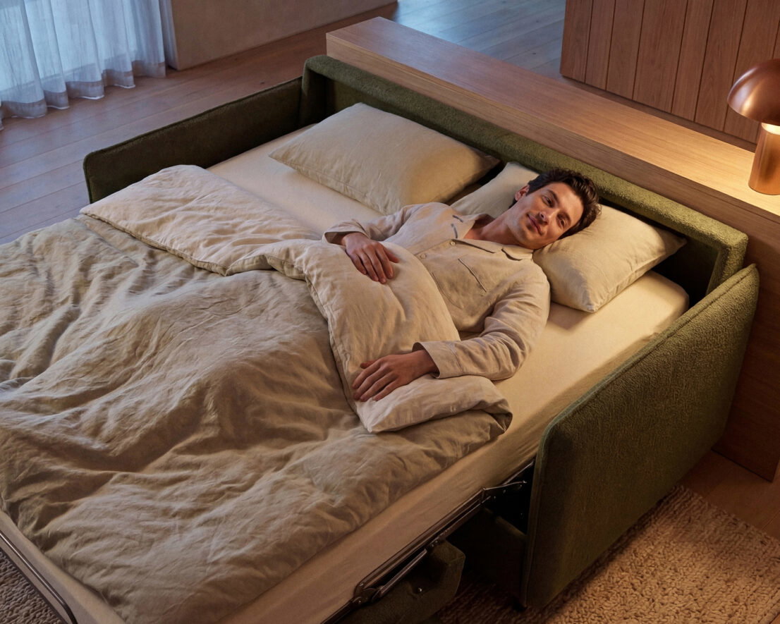 With a single, smooth movement, the bed unfolds. Inside, a thick, comfortable mattress ensures that the experience of sleeping feels just as considered as sitting.