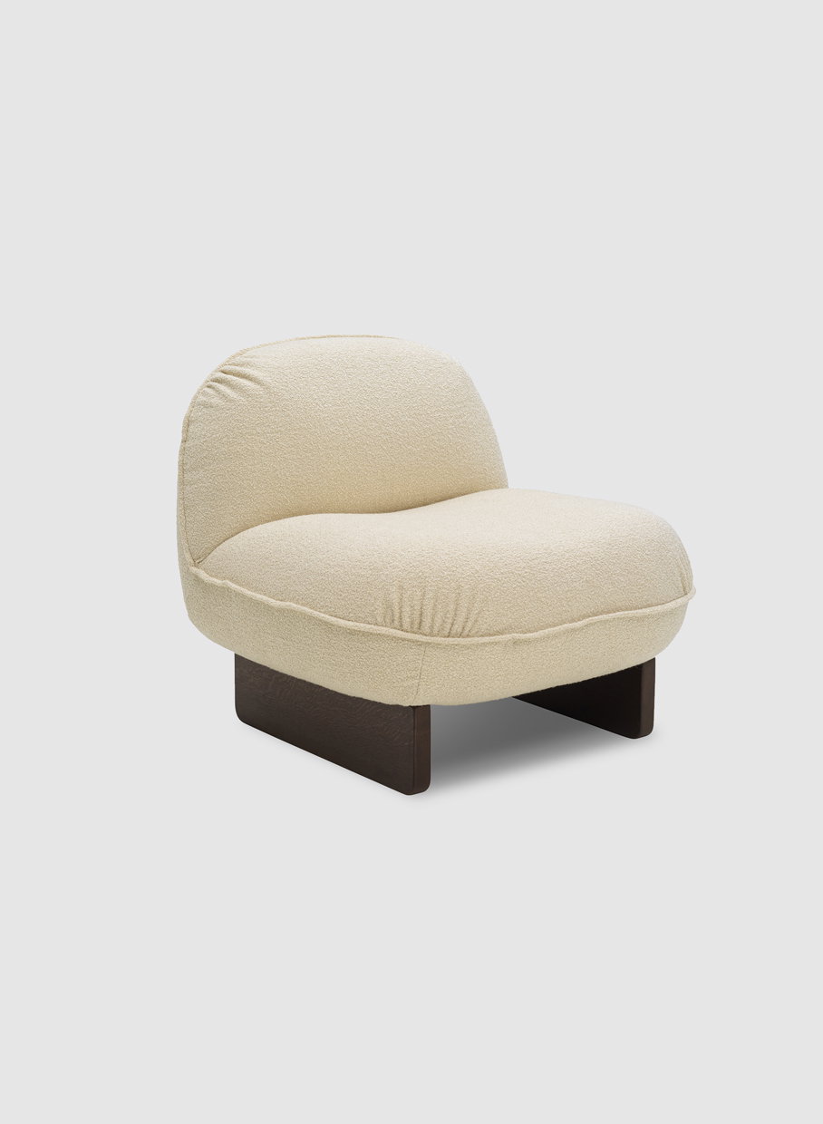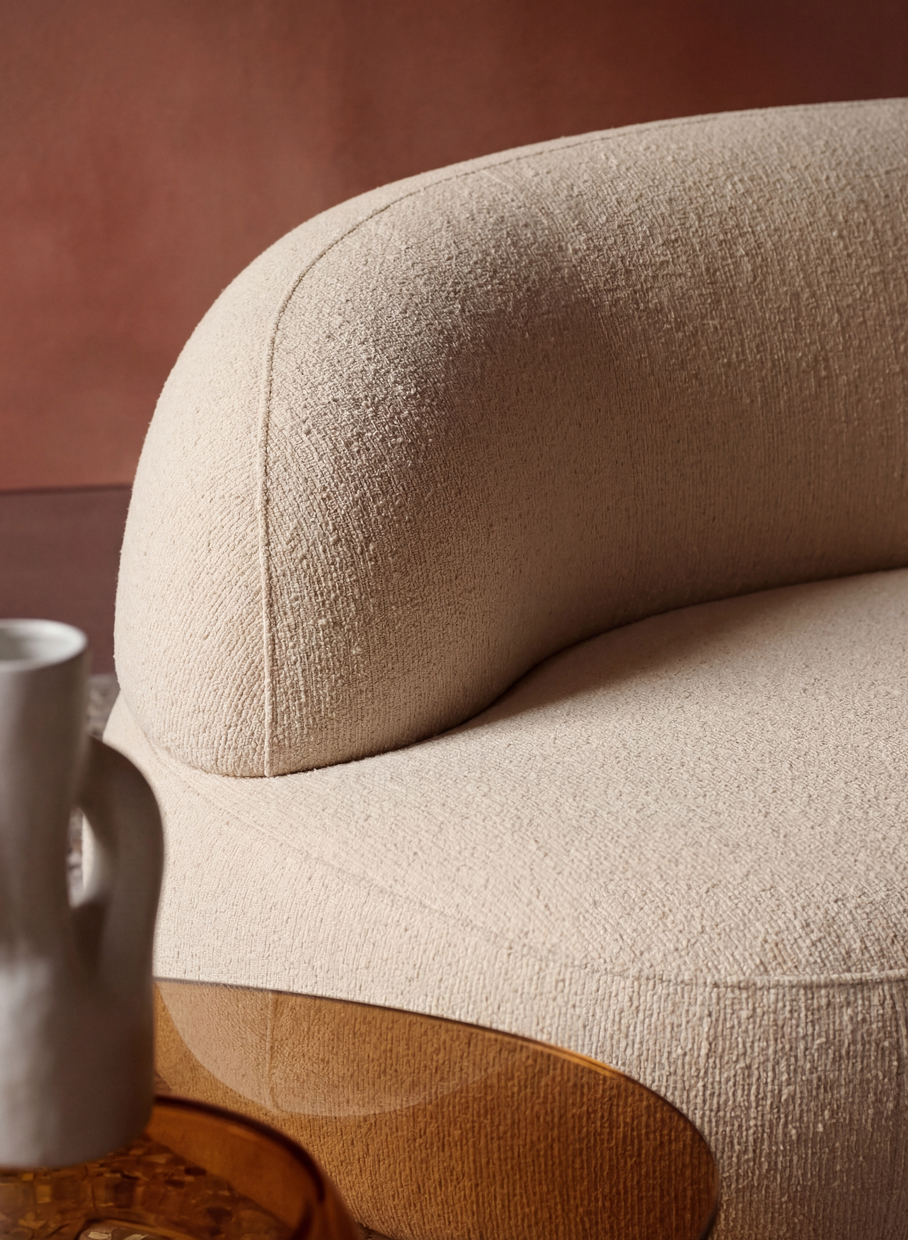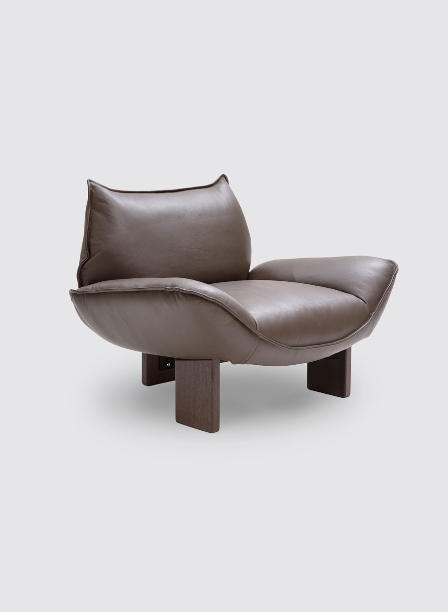 Senna has a bold, sculptural confidence and a soft, inviting spirit. Its generous curves create an embracing sense of comfort, while the low silhouette preserves a calm, distinctive presence. The design is defined by a striking contrast between softness and structure. The flowing seat and gently curved arms form a flowing shape, while the piping outlines the silhouette with a more tailored edge. Beneath, the solid wooden base adds depth and character, grounding the chair with a strong architectural feel.
