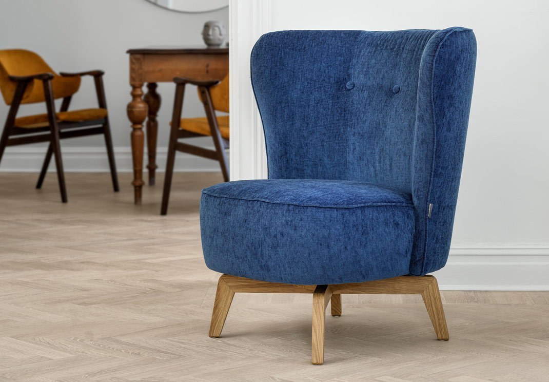 Mjuka, svepande linjer på både ryggstödet och sätet gör fåtöljen härligt att betrakta och ett riktigt nöje att sitta i. Du kan lägga till ett mer modernt utseende med de valbara svarta borstade metallbenen eller göra den mer klassisk med träben. Om du valde träben har den en valbar snurr - vilken naturligtvis har en returminnesfunktion.
