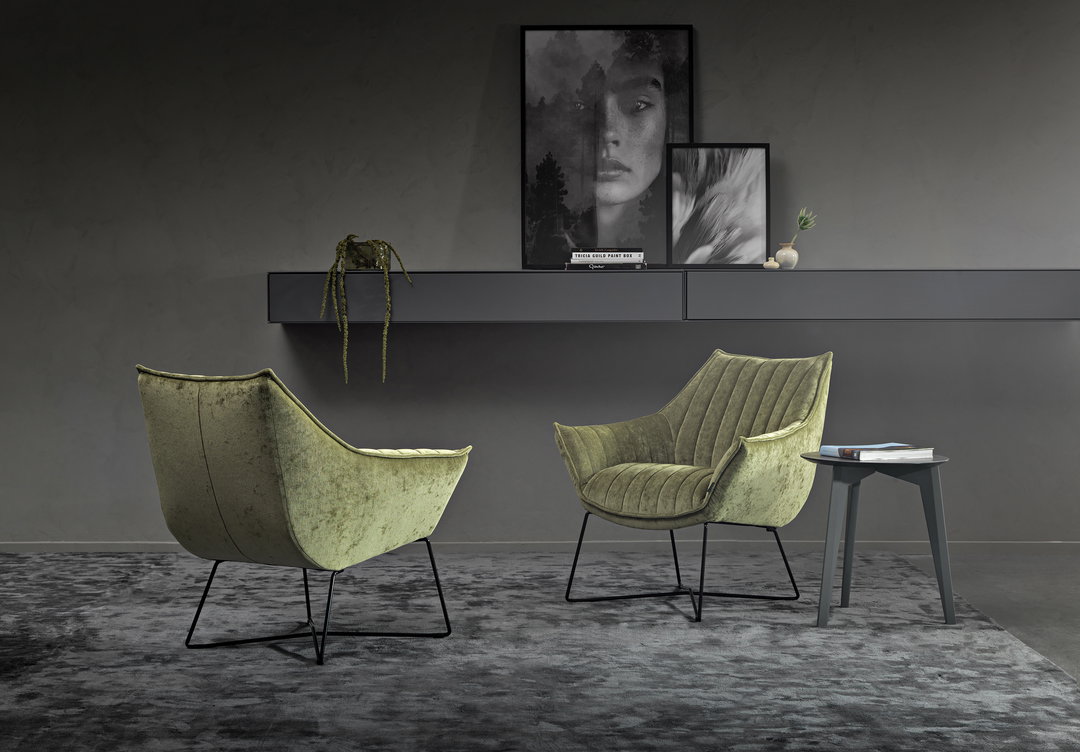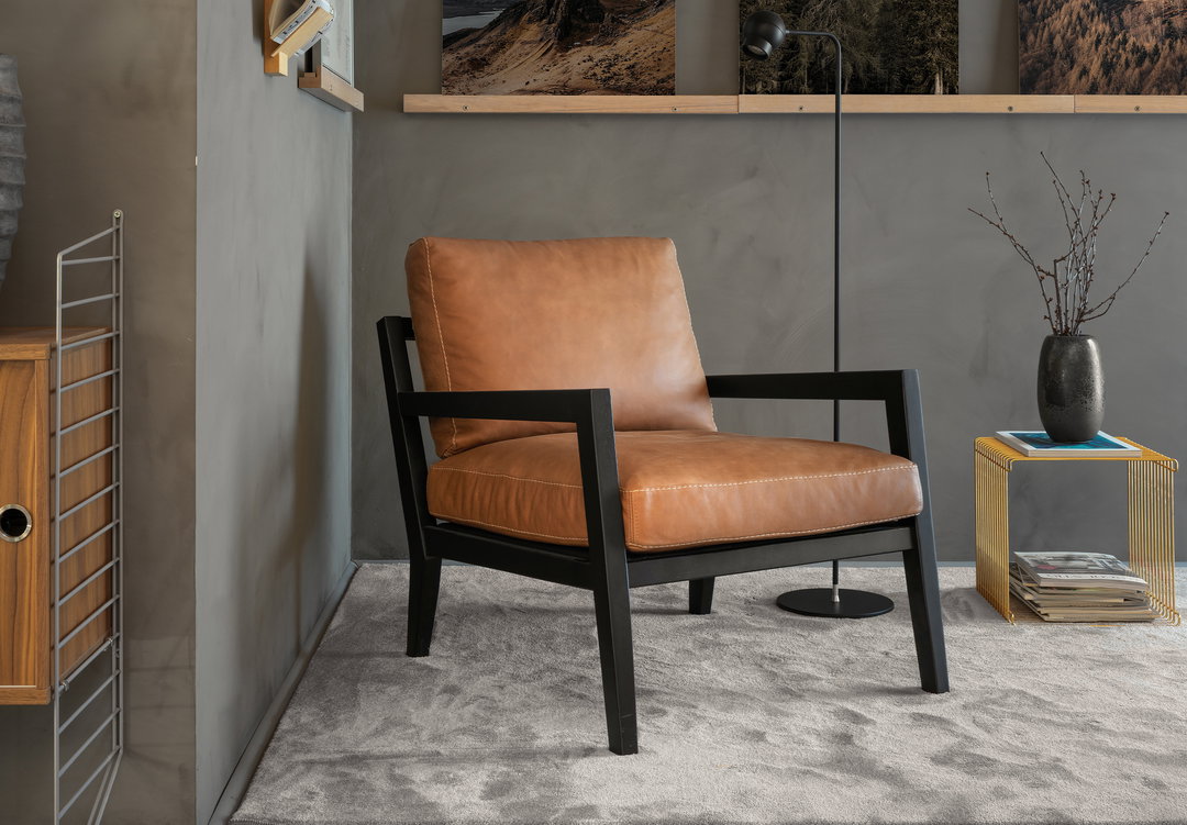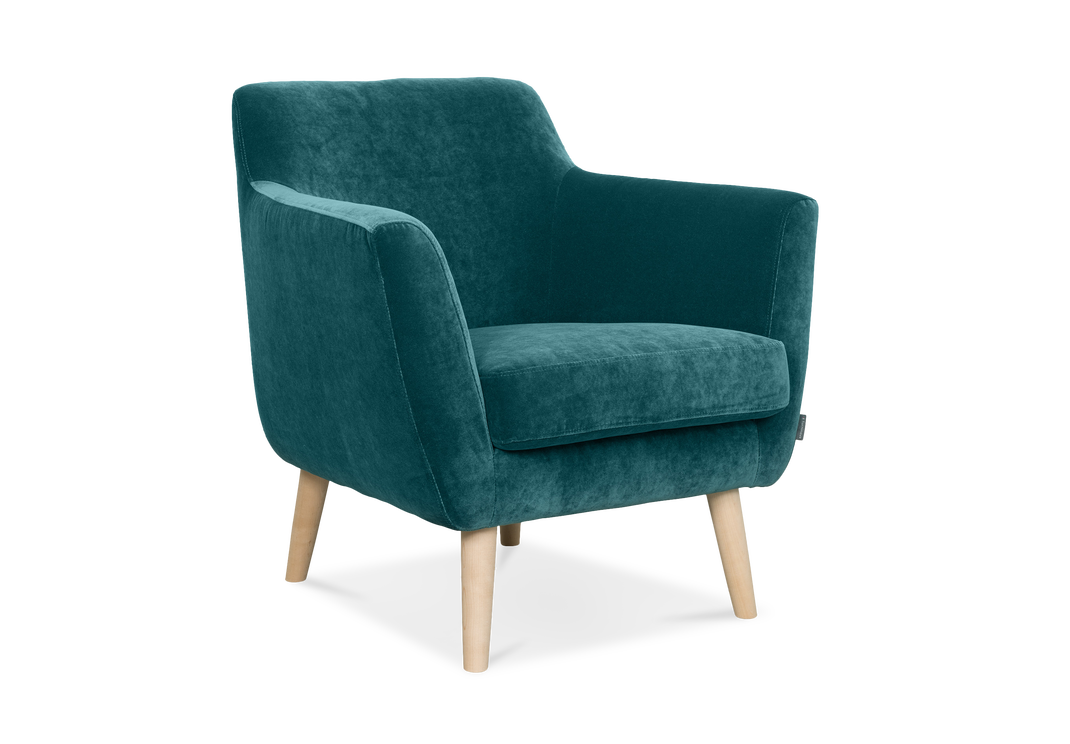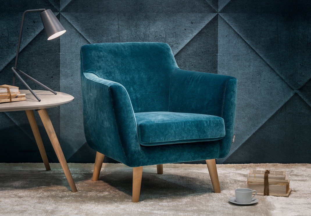 Dagmar är en nytolkning av den klassiska klubbfåtöljen. Benen i trä förstärker den klassiska retro looken.